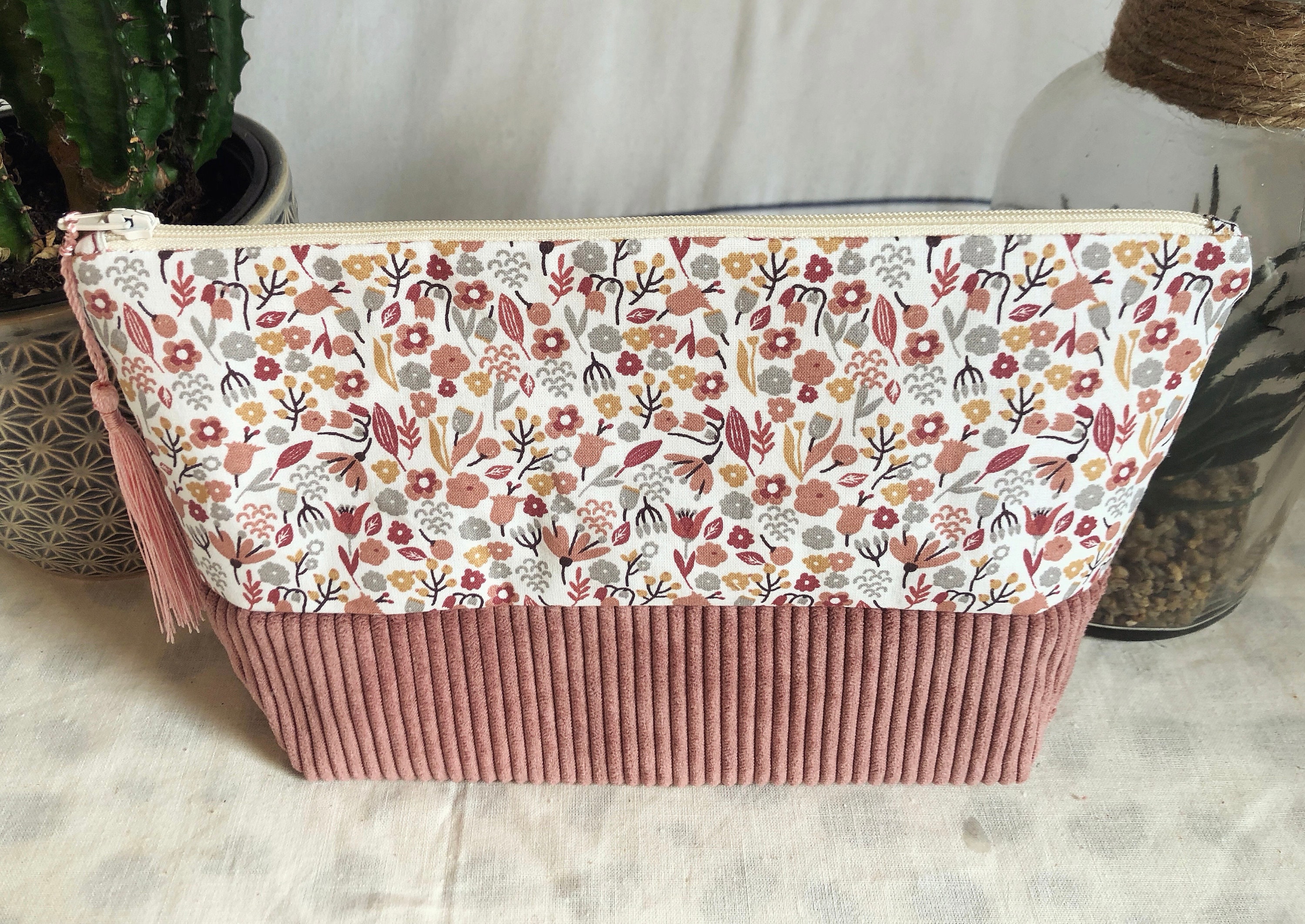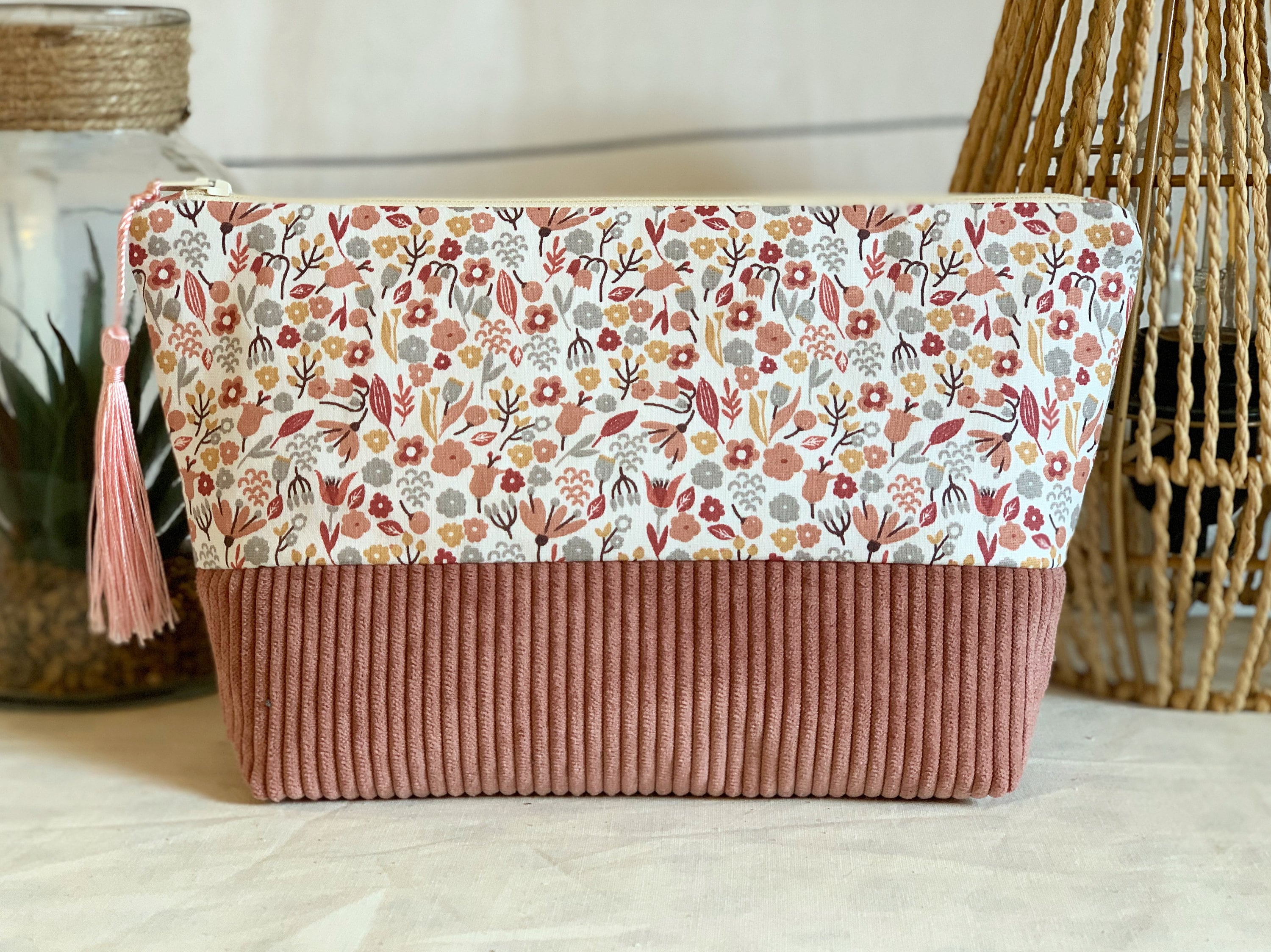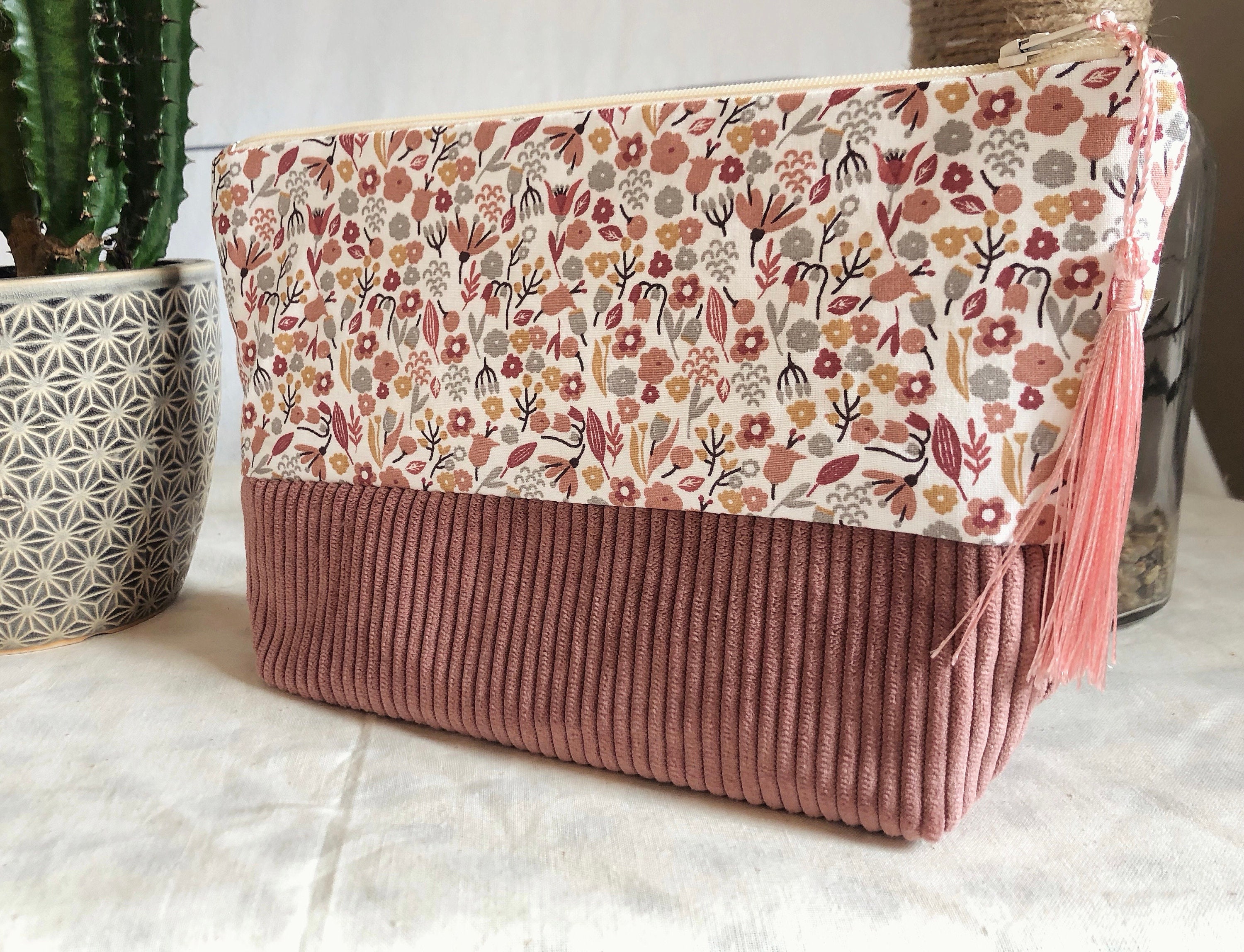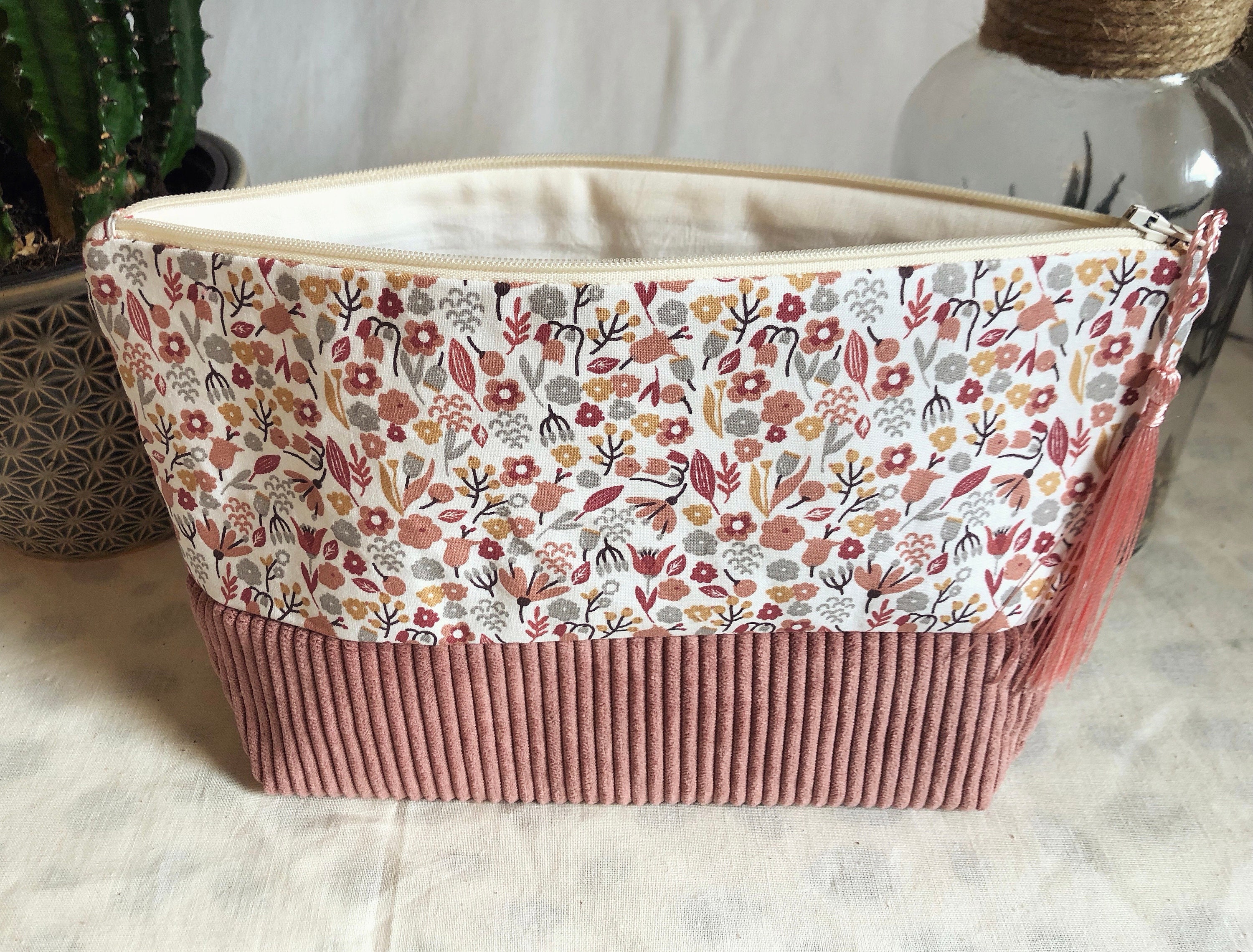 Toiletry bag, floral cotton and corduroy fabric. Ecru cotton lining fabric.Dimensions: L24 cm H17 cm D8 cmA small gift is included with the purchase of this kit 🥰🎁