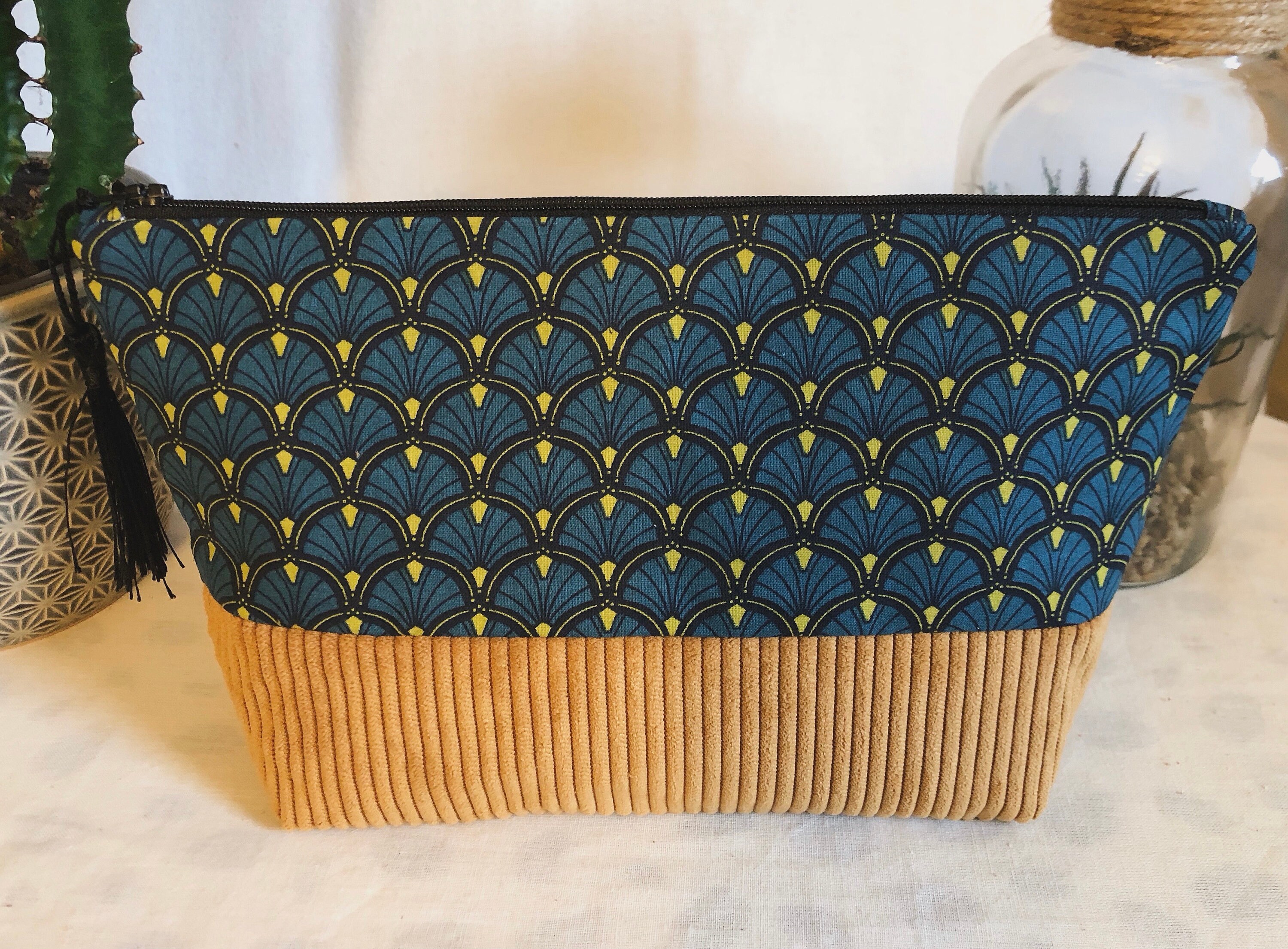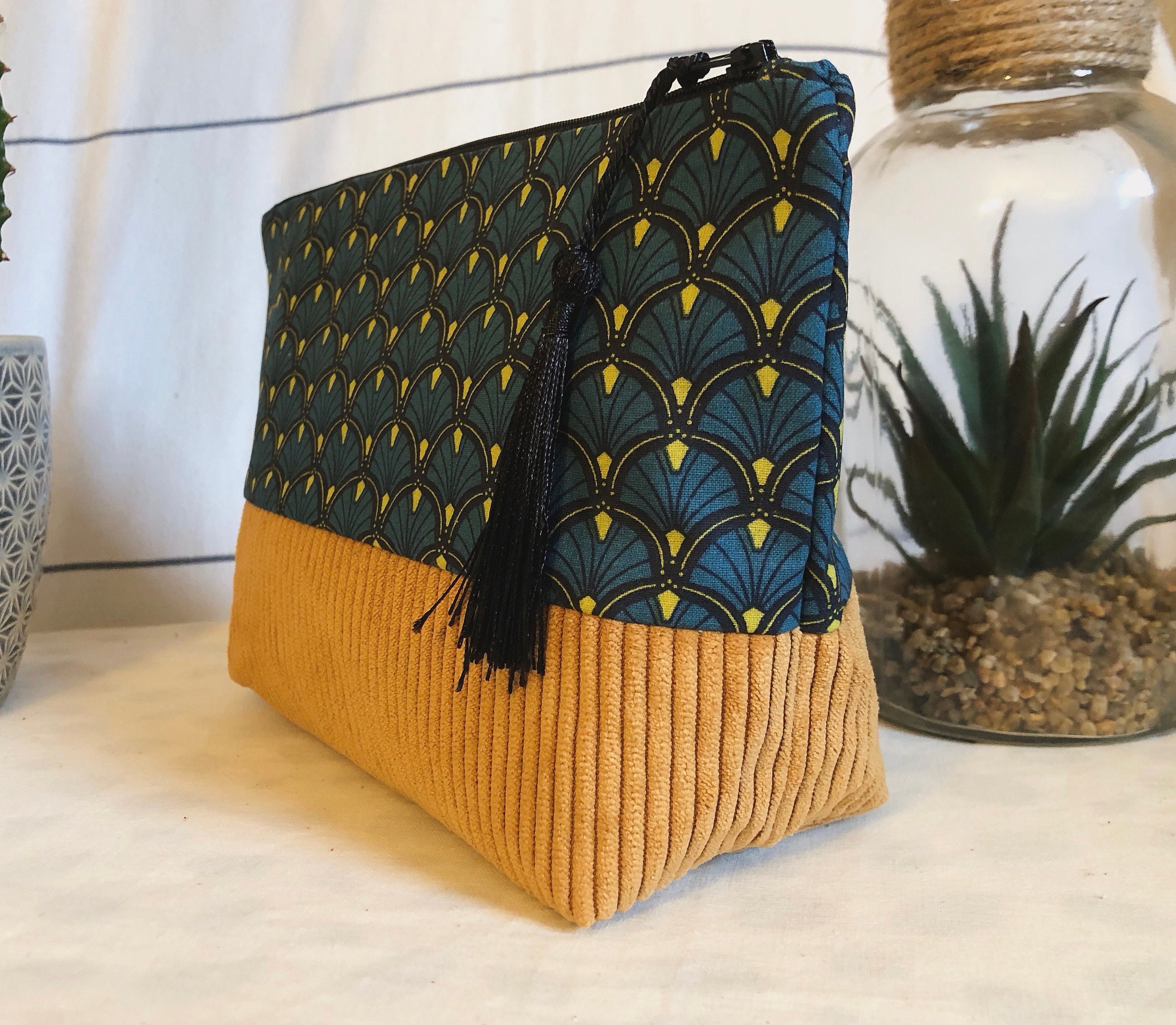 Toiletry bag in fan-patterned cotton fabric and corduroy. Black cotton lining.Dimensions: L25 cm H16 cm D8 cmA small gift is included with the purchase of this kit 🥰🎁