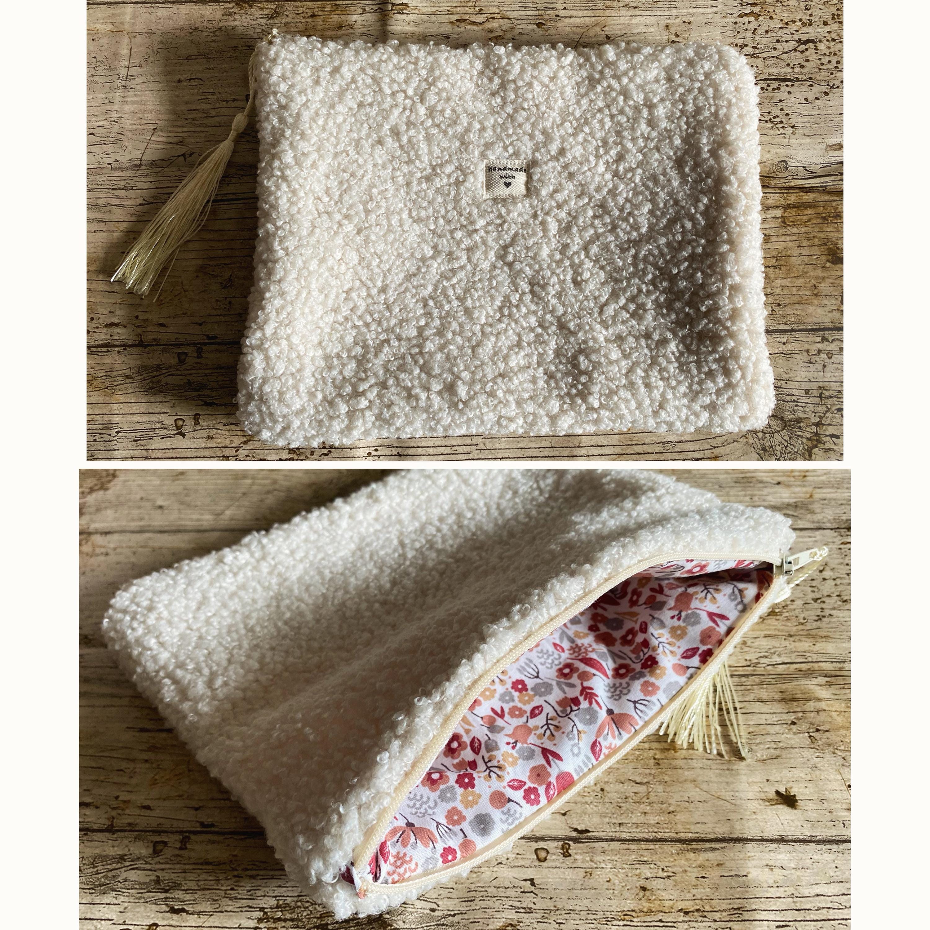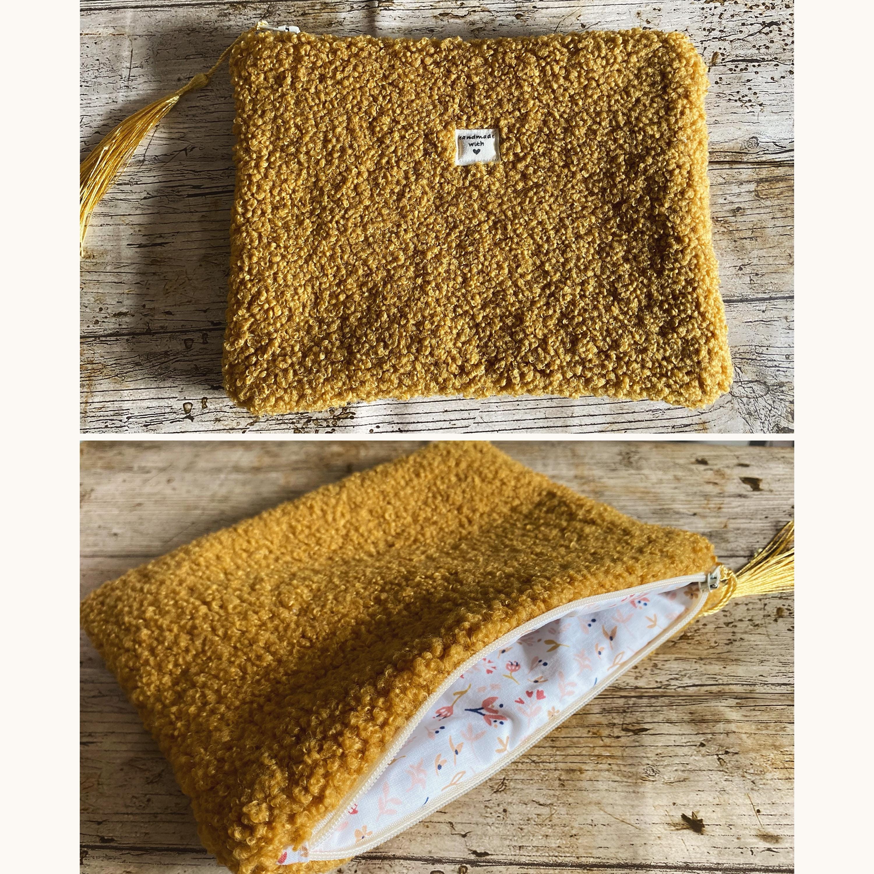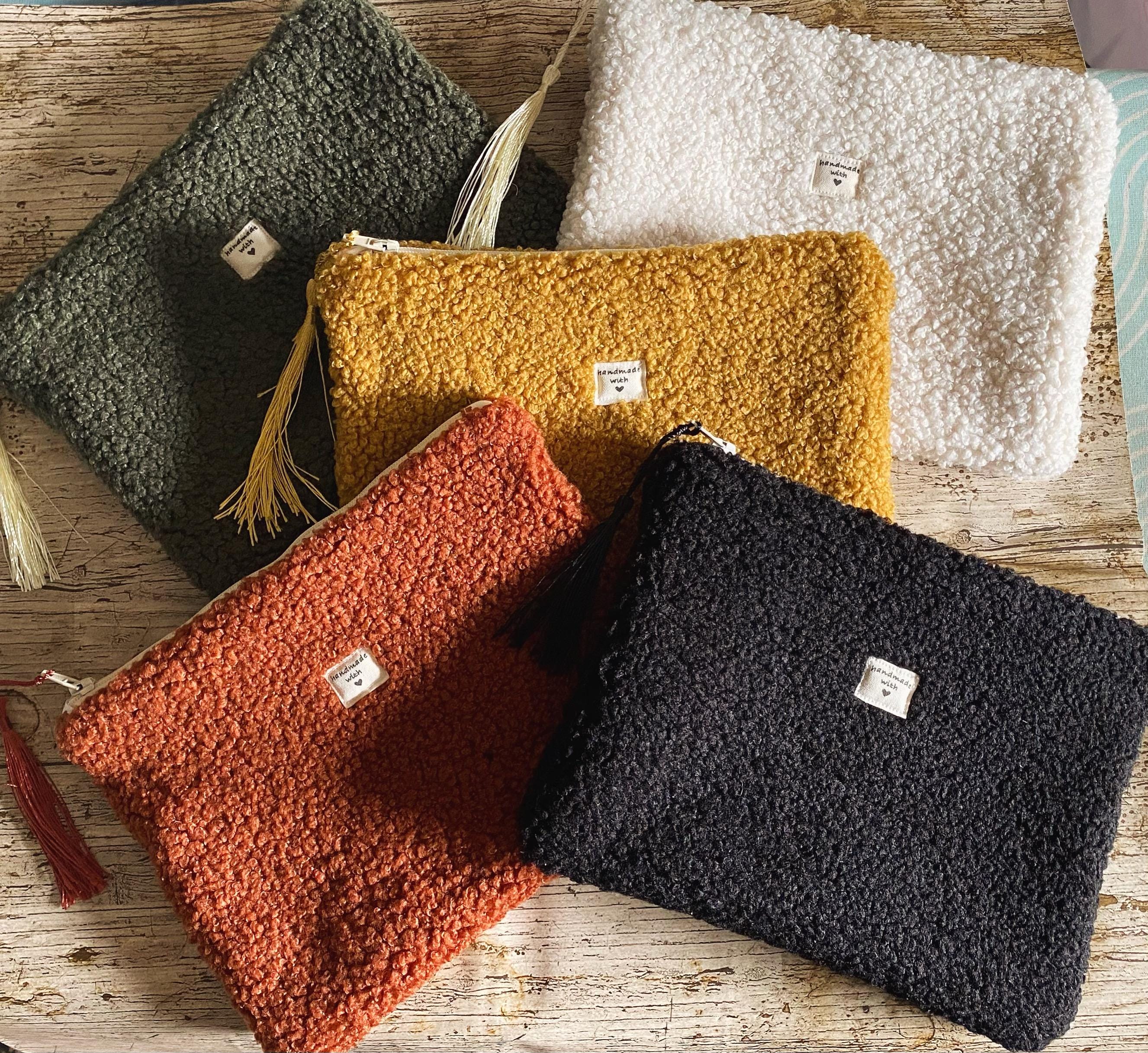 Flat pouch in multicoloured bouclé fabric, faux fur.Interior in patterned cotton fabric.Dimensions: Approximately L21 cm H15 cm