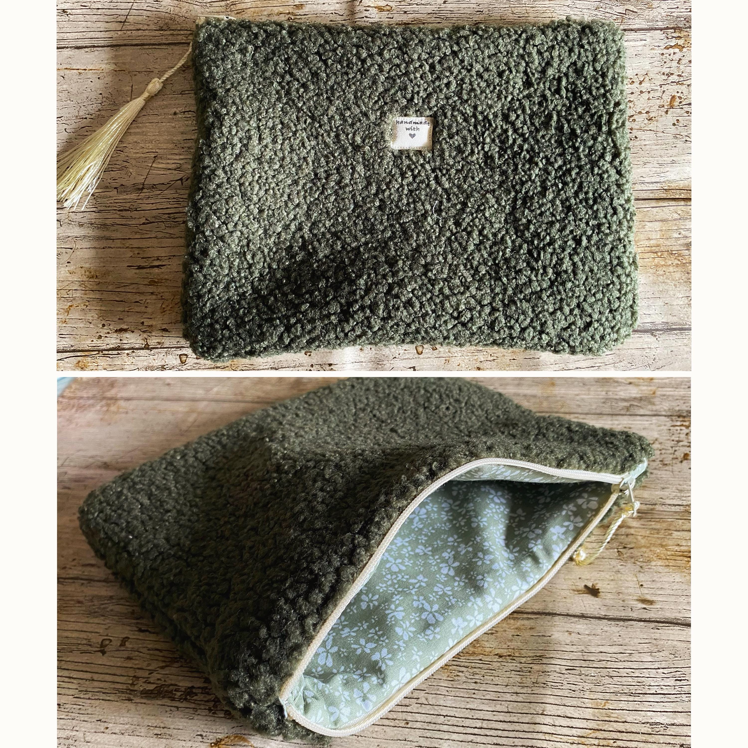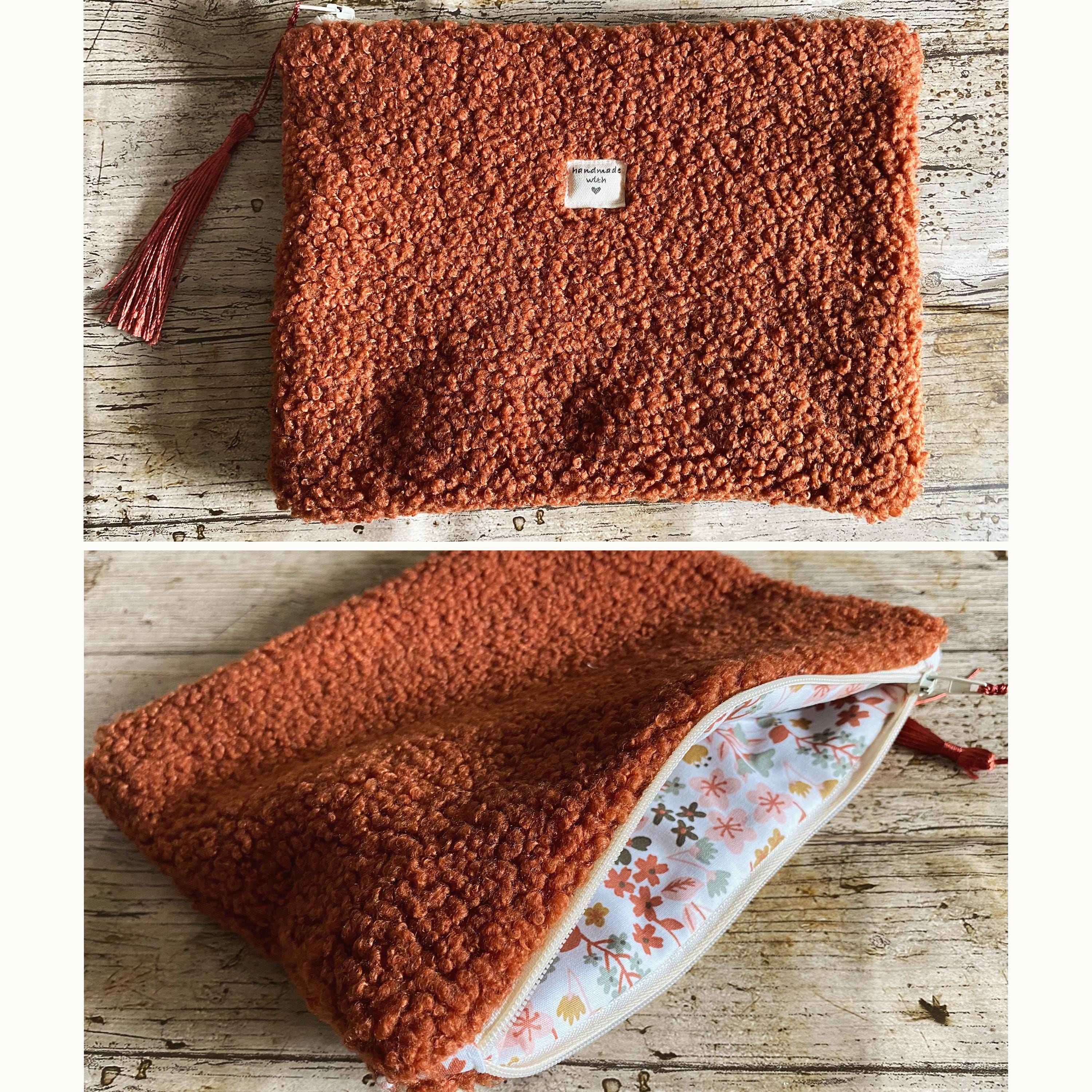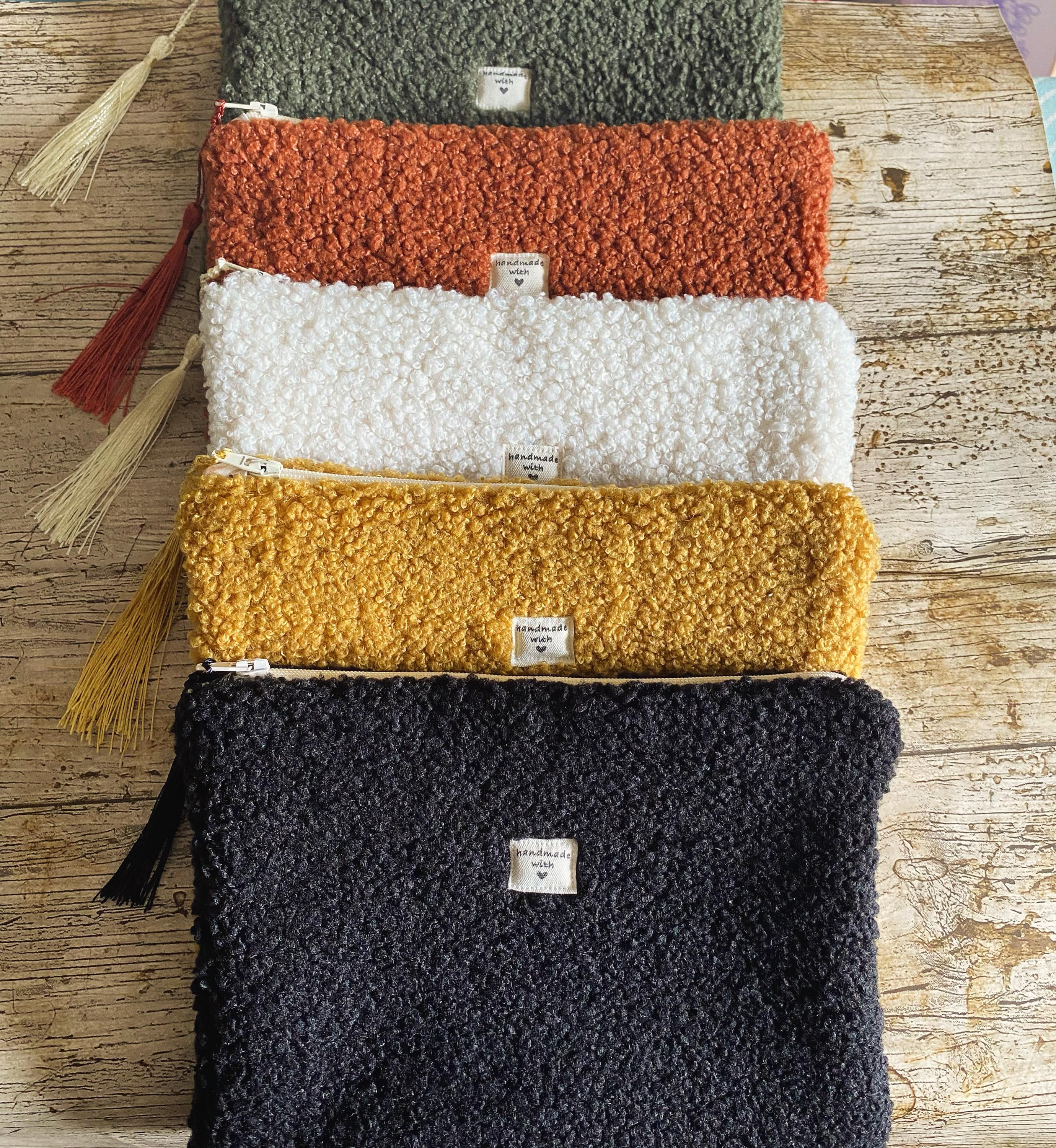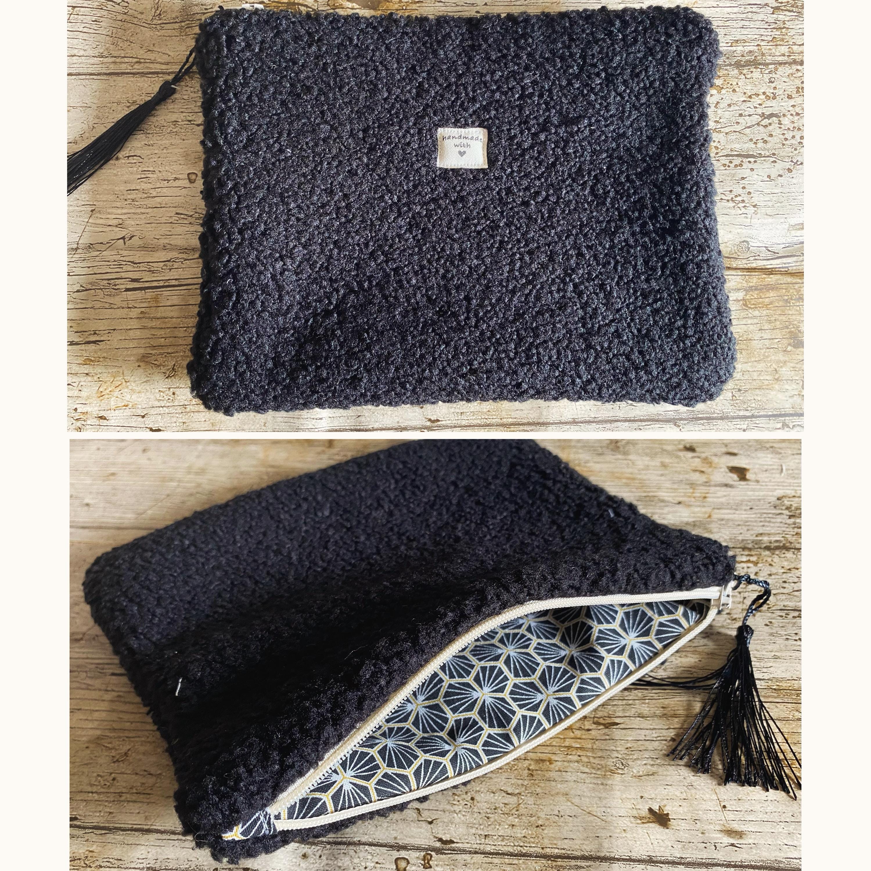 Flat pouch in multicoloured bouclé fabric, faux fur.Interior in patterned cotton fabric.Dimensions: Approximately L21 cm H15 cm