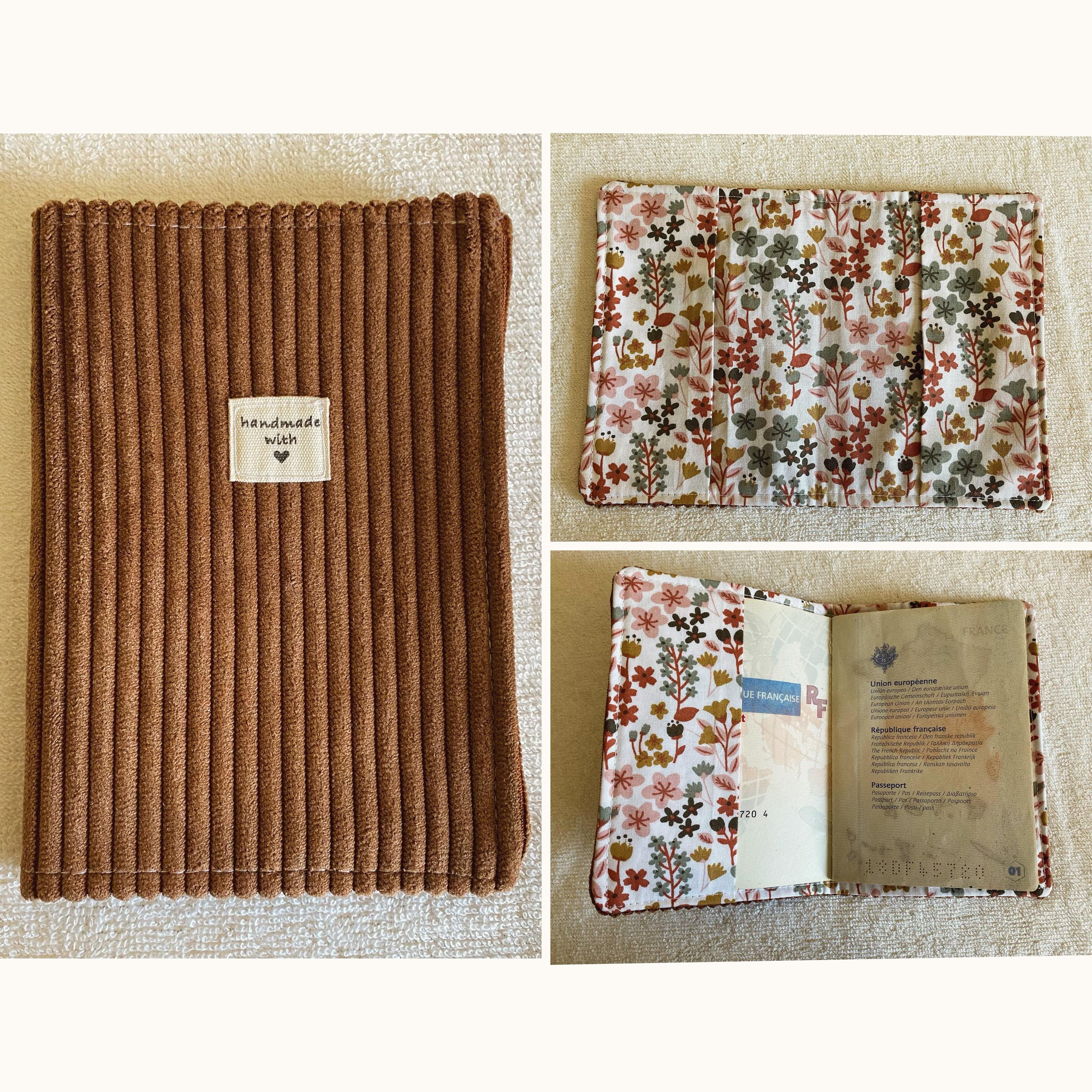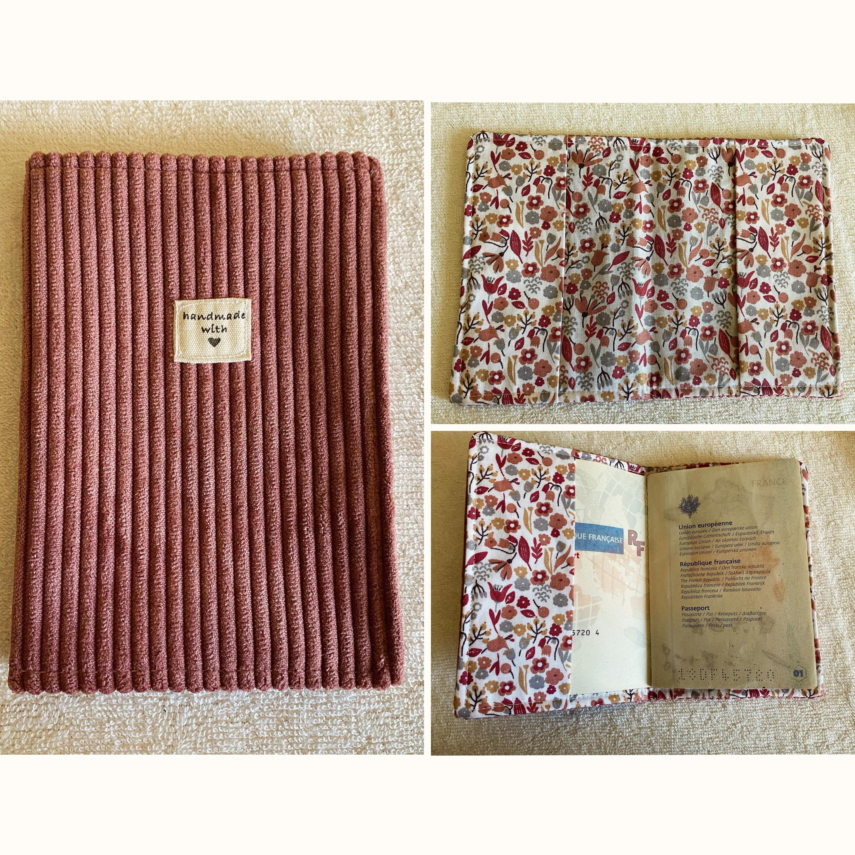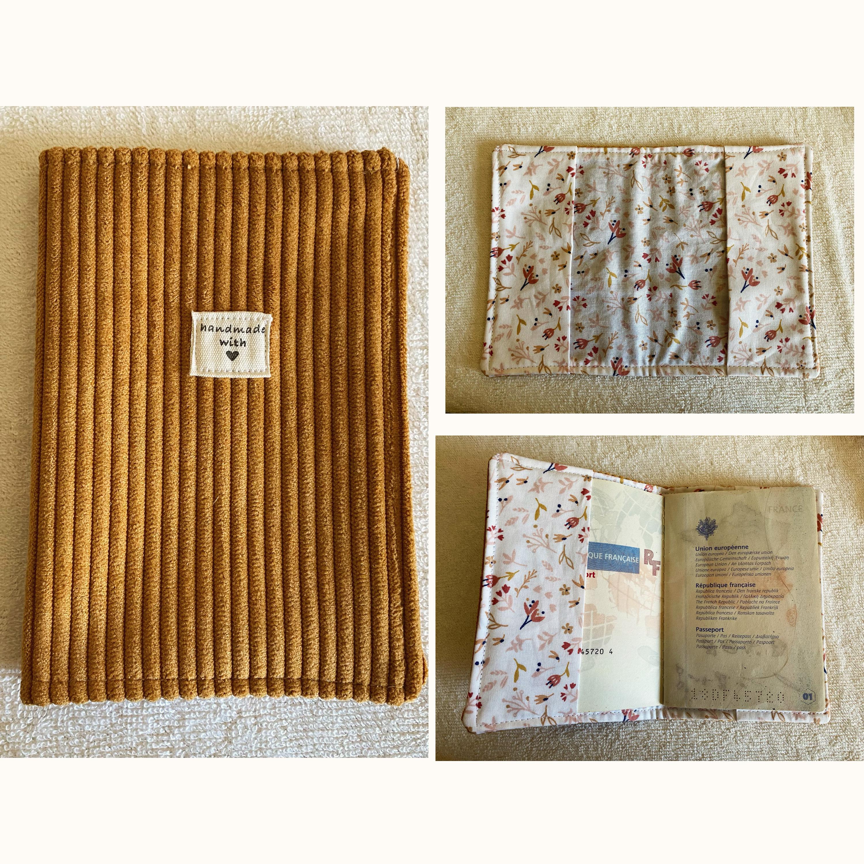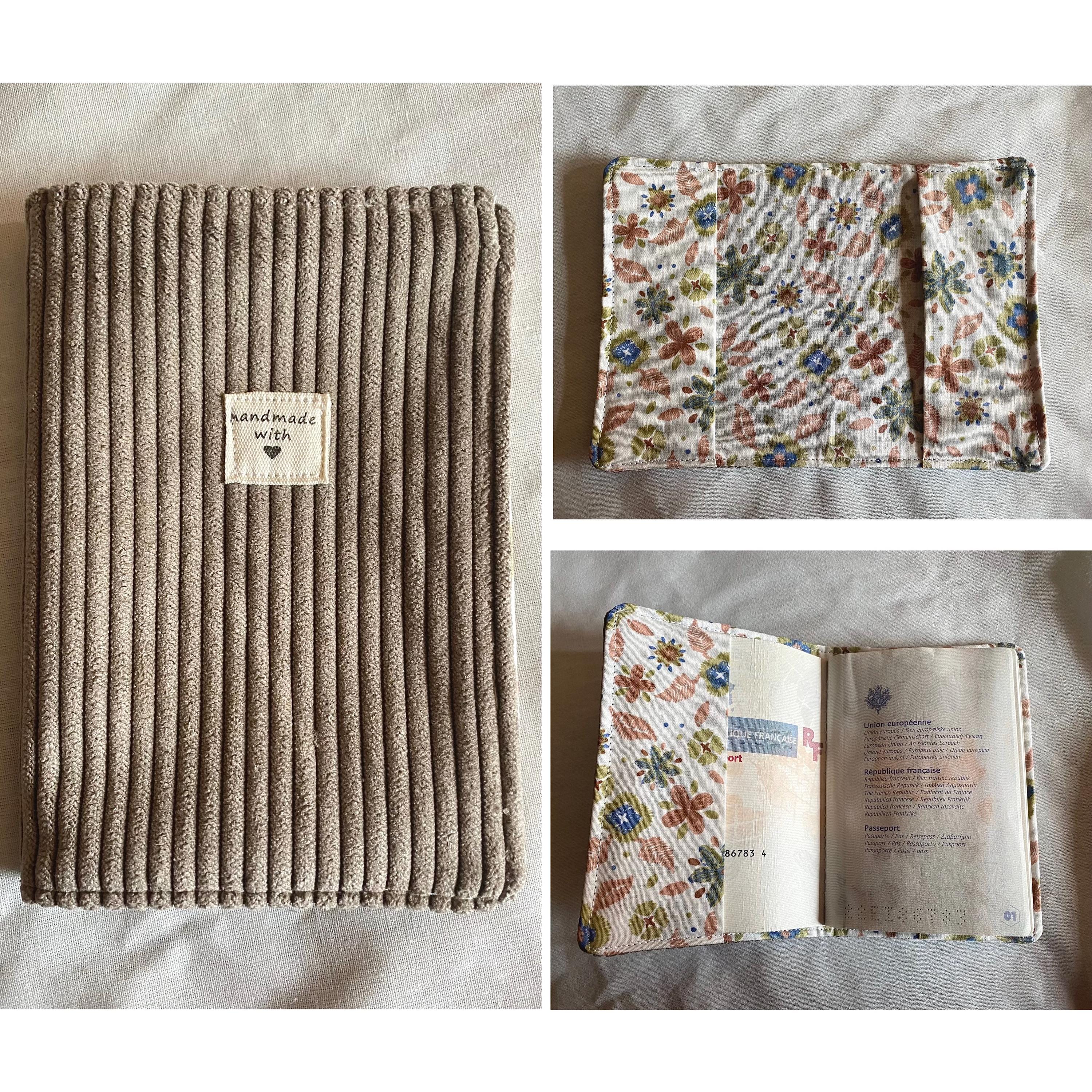Corduroy passport holder.Interior in cotton fabric.Several models available.Dimensions: H14cm W10cm (closed) W19.5cm (open)