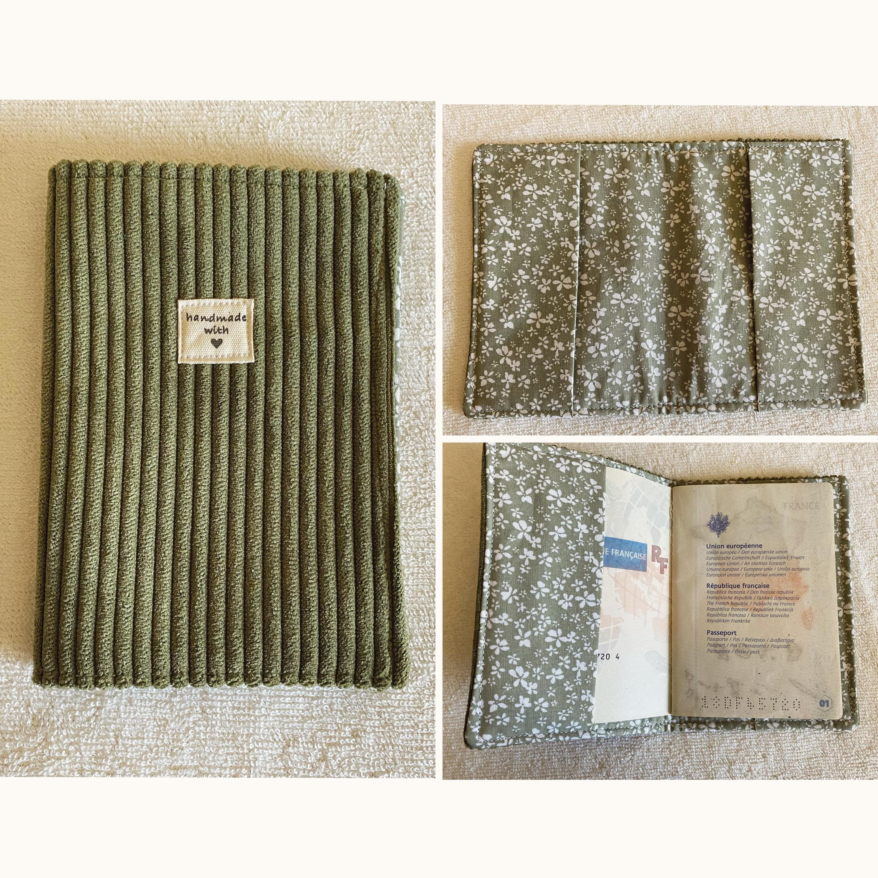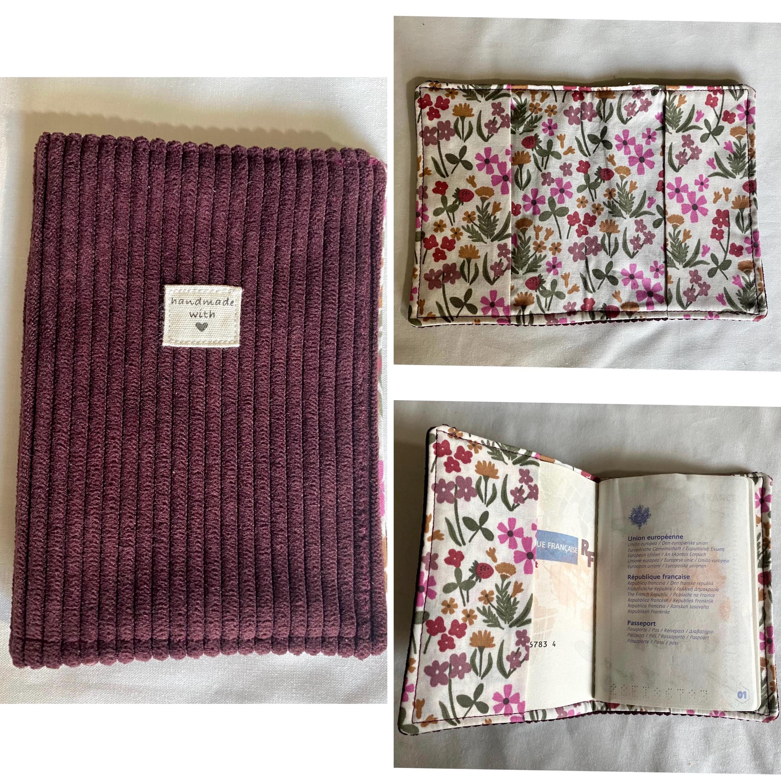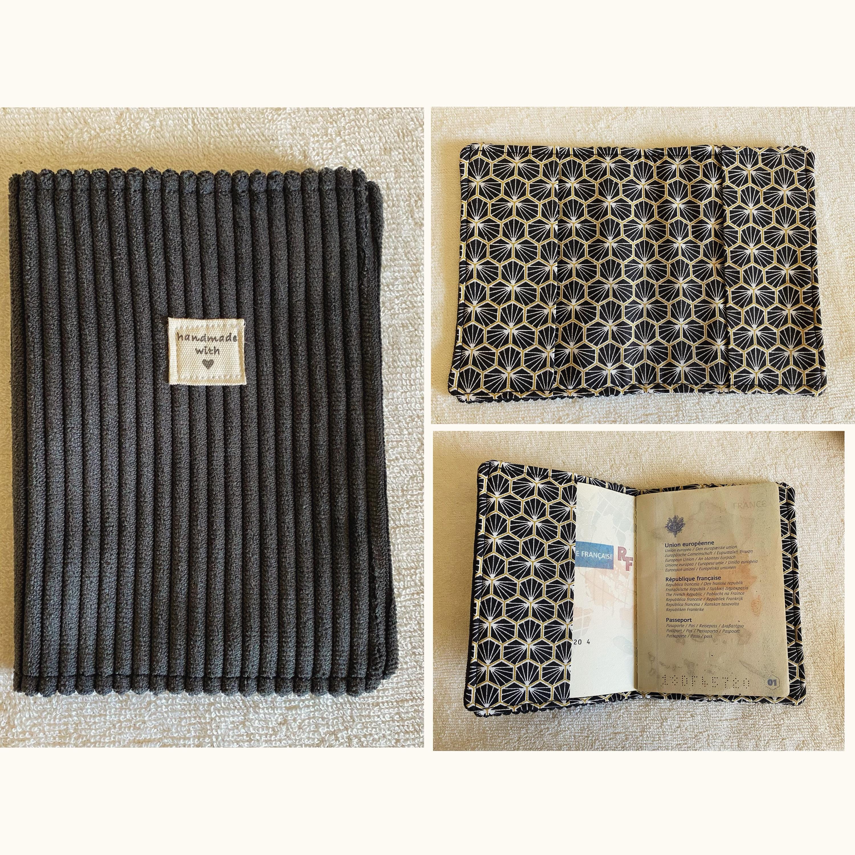 Corduroy passport holder.Interior in cotton fabric.Several models available.Dimensions: H14cm W10cm (closed) W19.5cm (open)