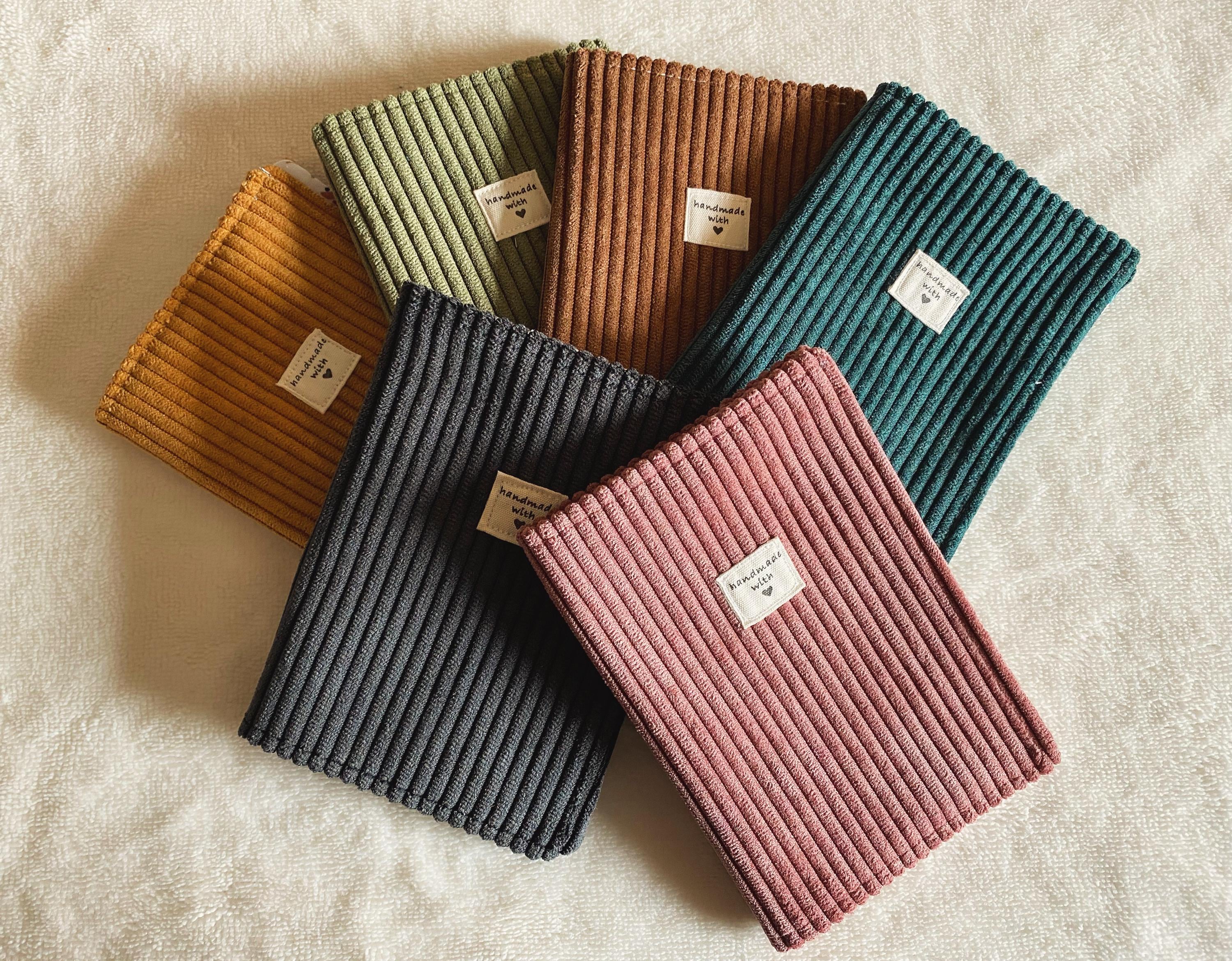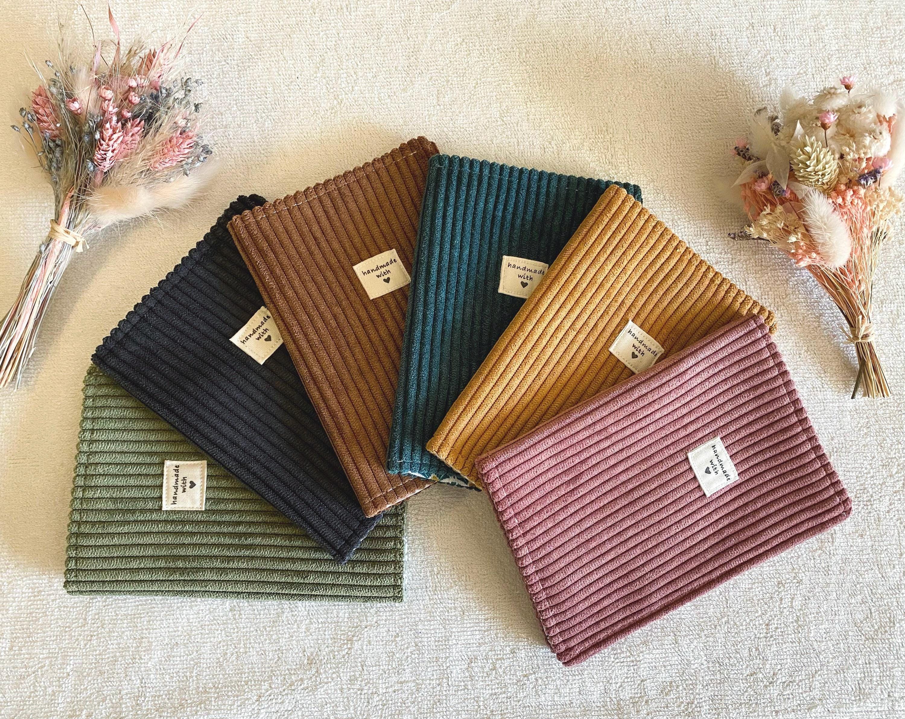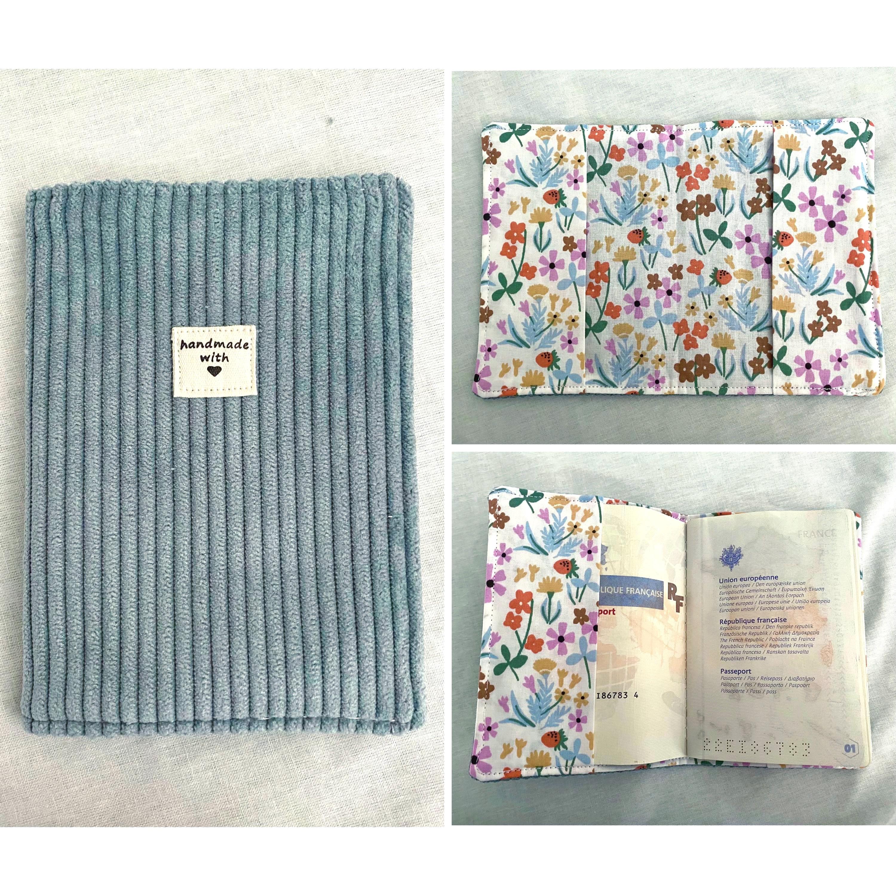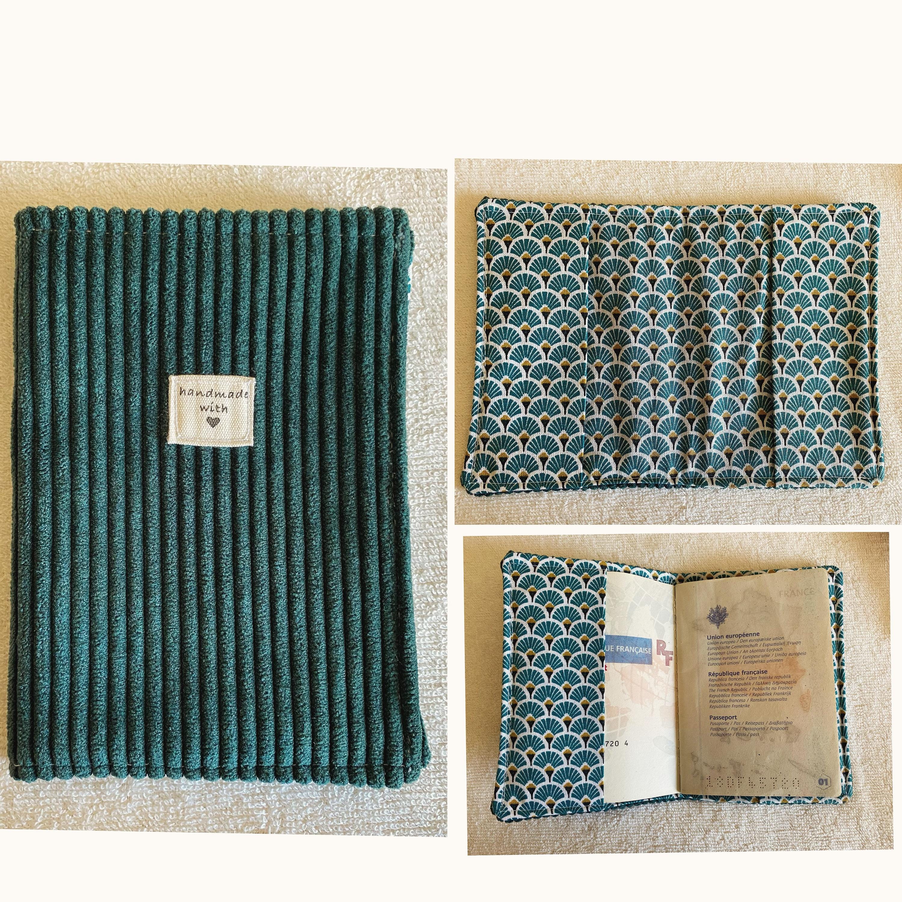 Corduroy passport holder.Interior in cotton fabric.Several models available.Dimensions: H14cm W10cm (closed) W19.5cm (open)
